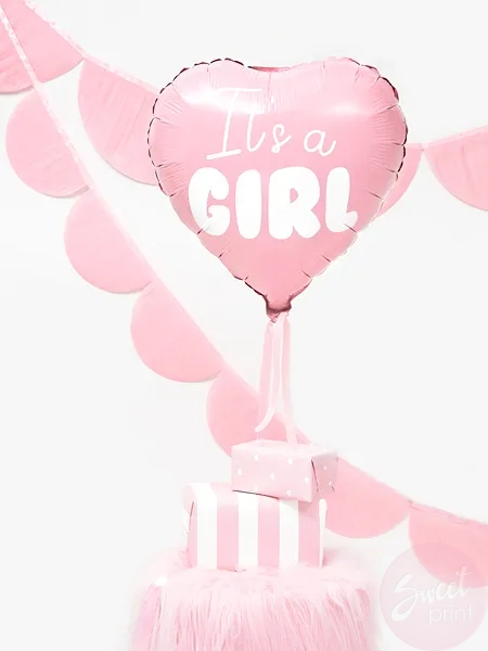 - jasnoróżowy balon foliowy w kształcie serca z białym napisem "It's a girl"