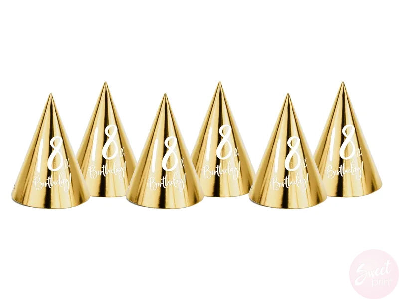 Złote papierowe czapeczki z napisem 18th Birthday