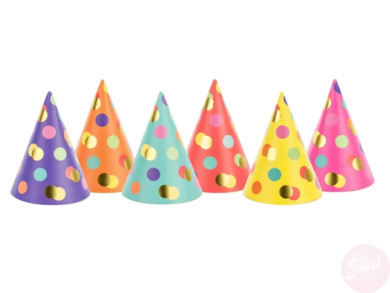 Papierowe czapeczki w 6 kolorach z kolorowymi i złotymi kropkami są idealnym dodatkiem na każdą imprezę!