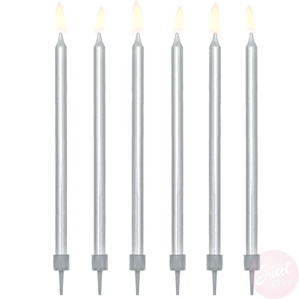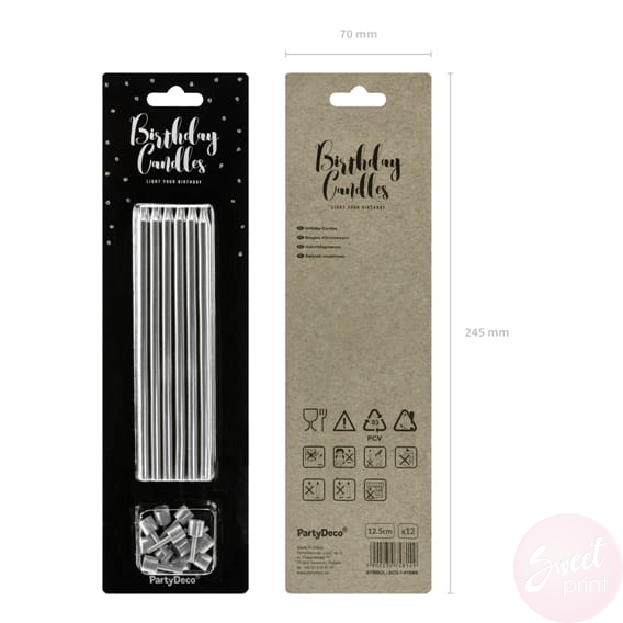 Srebrne, metalizowane świeczki będą świetnie wyglądać na wszelkich urodzinowych tortach i będą elegancką dekoracją zarówno dla młodszych jak i starszych jubilatów.
