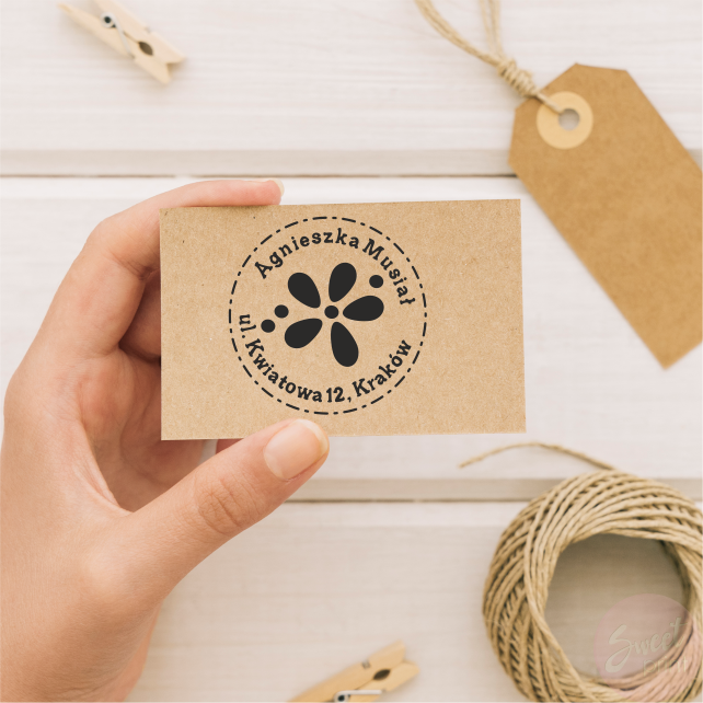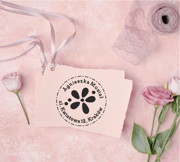 Personalizowana pieczątka osobista z motywem kwiatka.