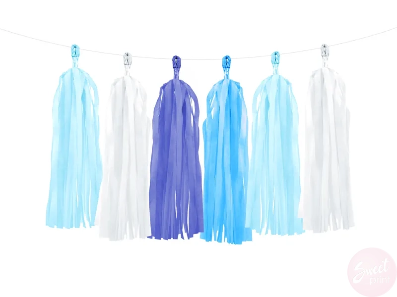 - zestaw: 3 białe frędzle, 3 niebieskie frędzle, 3 błękitne frędzle, 3 granatowe frędzle, biały sznurek (ok. 2m)