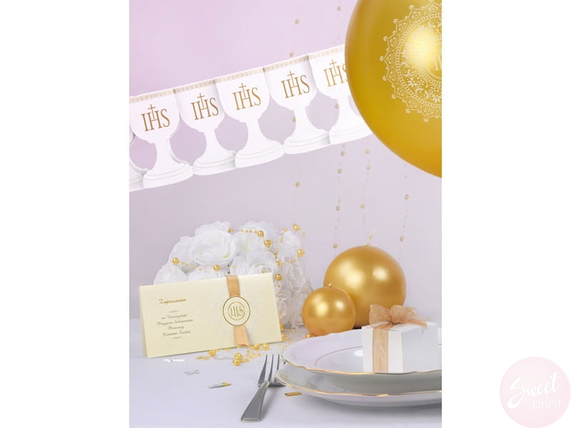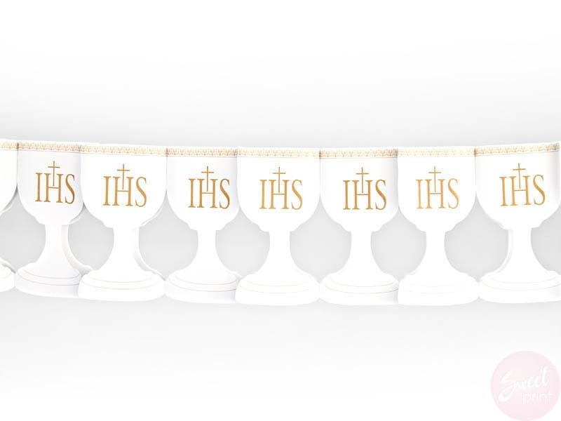 Świętuj z radością zawieszając tę girlandę na przyjęciu z okazji Pierwszej Komunii! Dekoracja z papierowych kielichów doda uroku Twojej uroczystości.