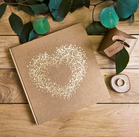 Okładka z papieru kraft jest ozdobiona złotym nadrukiem w kształcie serca.