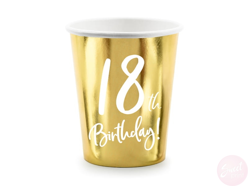 Papierowe kubeczki w złotym kolorze z napisem 18th Birthday są idealnym dodatkiem na imprezę z okazji osiemnastych urodzin!