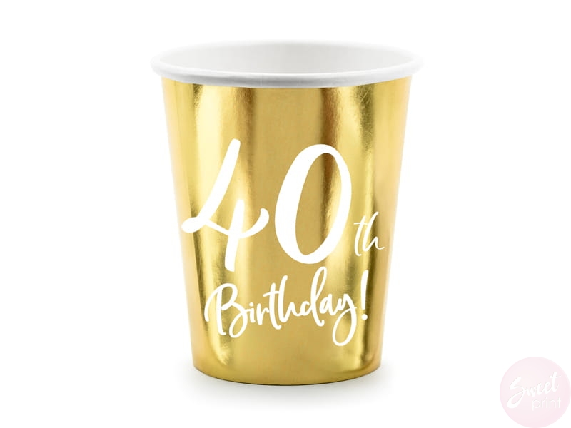 Papierowe kubeczki w złotym kolorze, z napisem 40th Birthday są idealnym dodatkiem na imprezę z okazji czterdziestych urodzin!