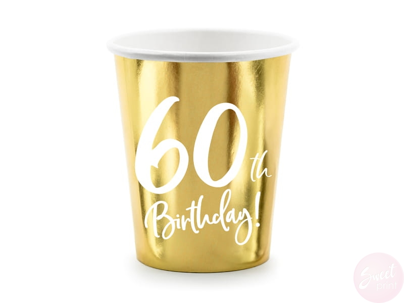 Papierowe kubeczki w złotym kolorze, z napisem 60th Birthday są idealnym dodatkiem na imprezę z okazji sześćdziesiątych urodzin!