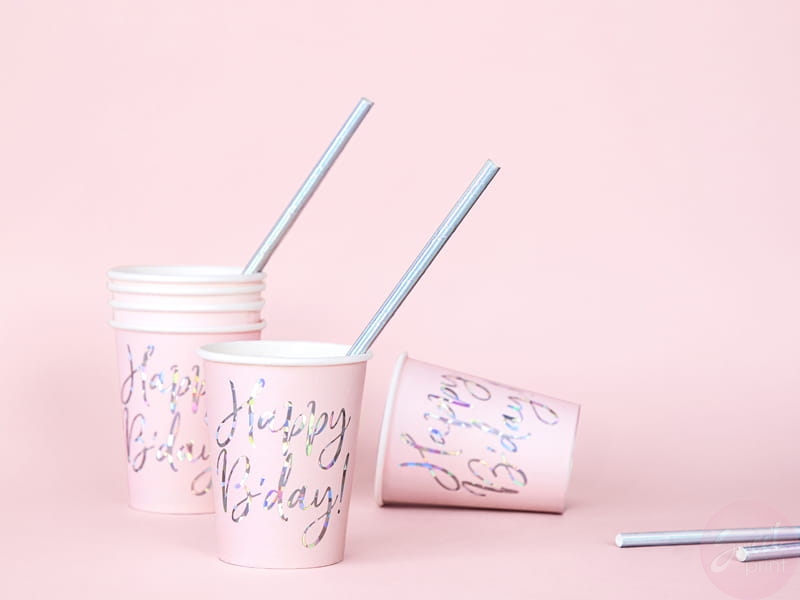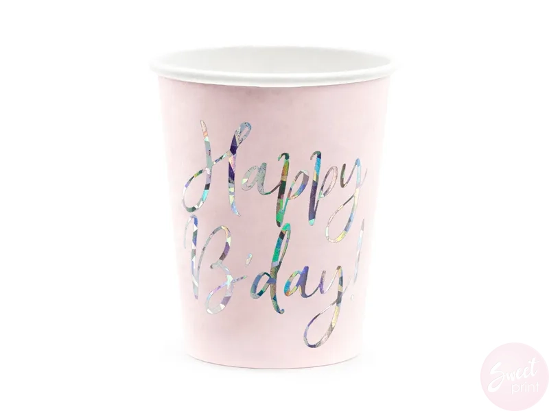 Papierowe kubeczki w kolorze pudrowego różu z holograficznym napisem Happy B'day! są idealnym dodatkiem na każdą imprezę urodzinową!