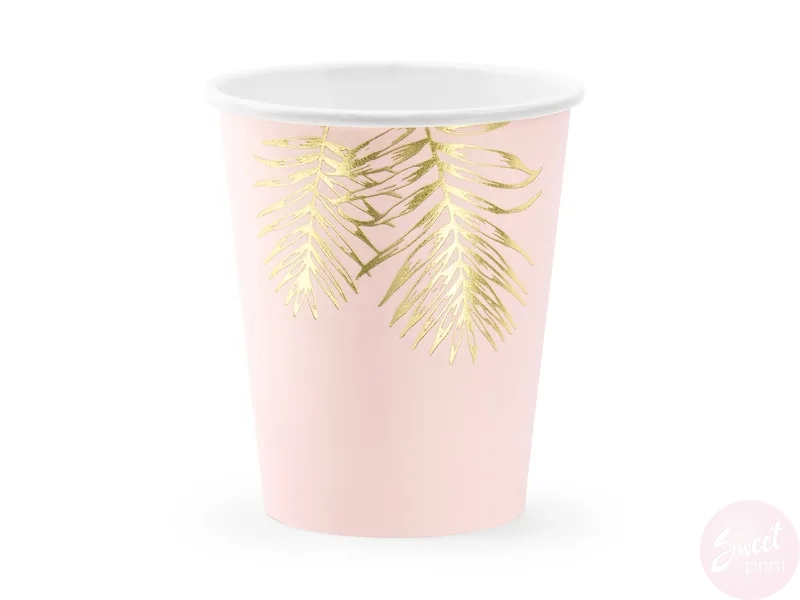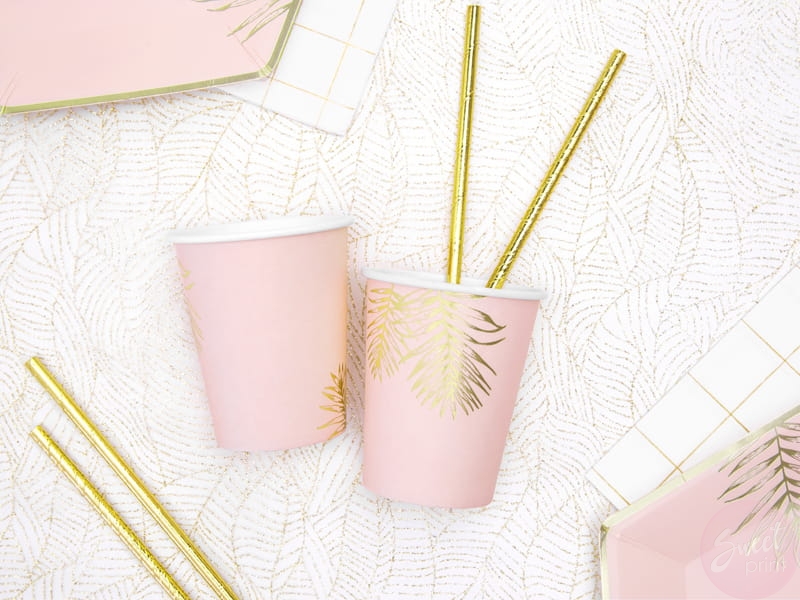 Jasnoróżowe papierowe kubeczki ze złotymi liśćmi są idealnym dodatkiem na każdą imprezę!