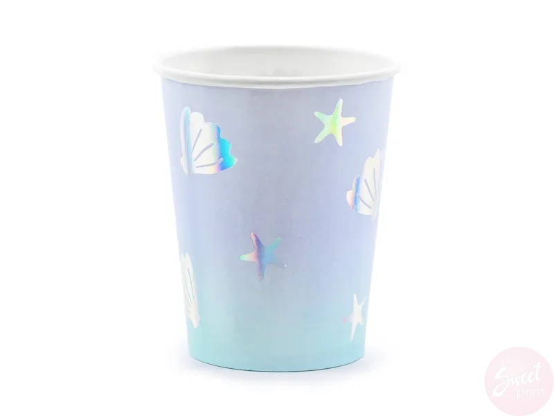 Papierowe kubeczki z holograficznymi rozgwiazdami i muszelkami są idealnym dodatkiem na przyjęcie urodzinowe!