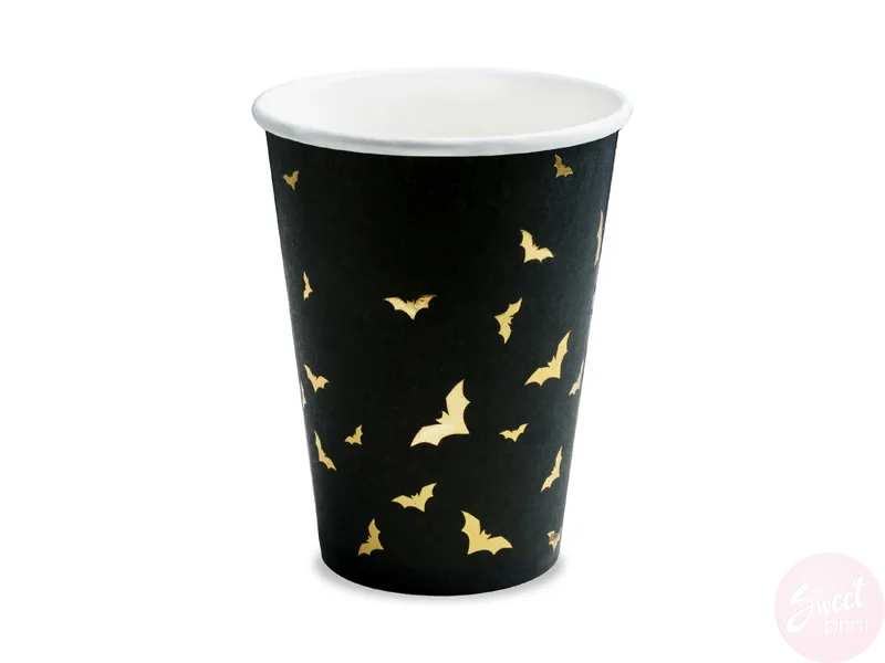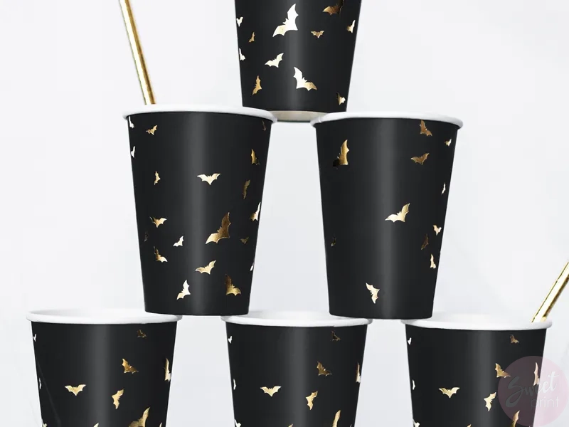 Papierowe kubeczki ze złotymi nietoperzami są idealnym dodatkiem na imprezę halloween!