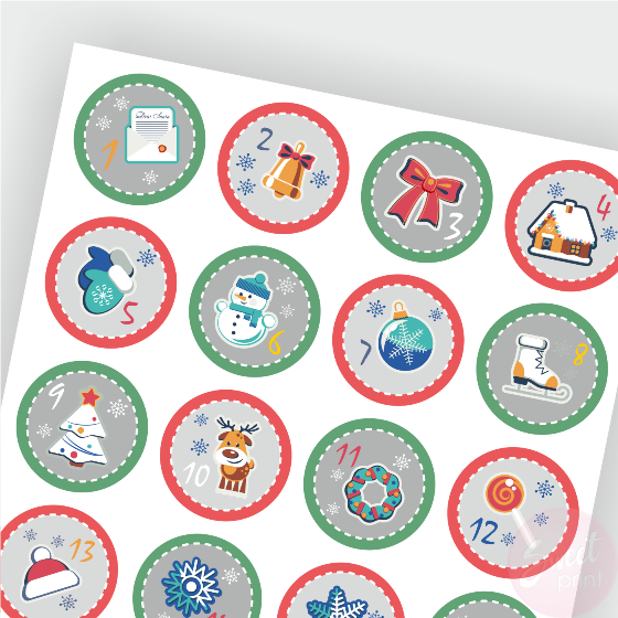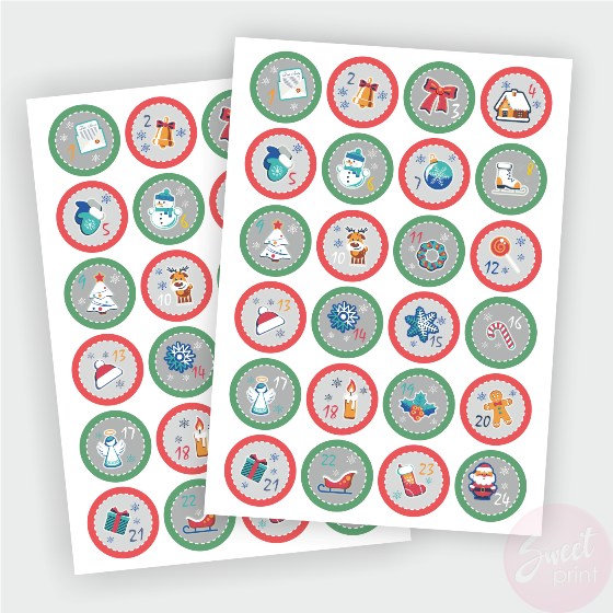 - 24 naklejki z cyferkami od 1 do 24 oraz świątecznymi motywami