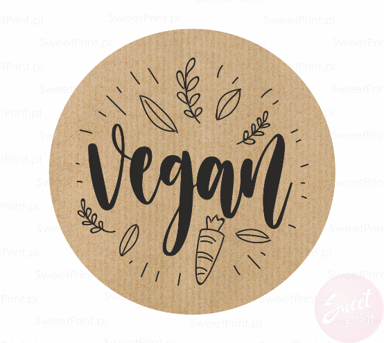 Naklejki w stylu eko z napisem Vegan ozdobią Twoje produkty i posłużą jako dodatek do opakowań i przesyłek. Doskonale nadadzą się do wykończenia opakowań i produktów wegańskich.