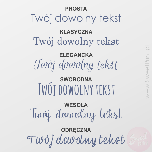 Tekst na wszystkich naklejkach w komplecie jest taki sam. Jeśli chcesz naklejki z różnymi napisami - dla każdego napisu zamów osobny komplet.