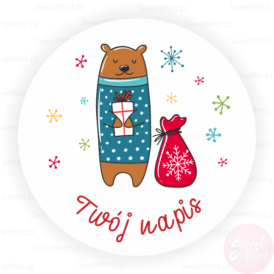 Te okrągłe naklejki świetnie nadają się na koperty świąteczne, torebki i pudełka na prezenty a także na świąteczne przesyłki Twojej firmy. Wydrukujemy na nich Twoje imię, nazwę Twojej firmy, krótkie życzenia lub inny tekst.