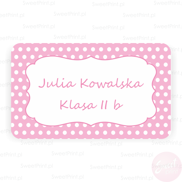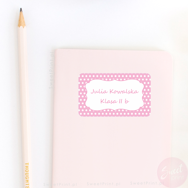 Na tych delikatnych naklejkach w kropeczki wydrukujemy imię i nazwisko, klasę lub inny dowolny tekst.