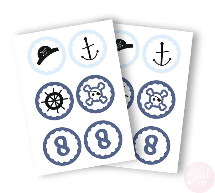 Zestaw kolorowych naklejek z pirackimi motywami oraz podaną przez Ciebie cyferką / liczbą. Takie naklejki będą idealną dekoracją na Pirackie przyjęcie urodzinowe!
