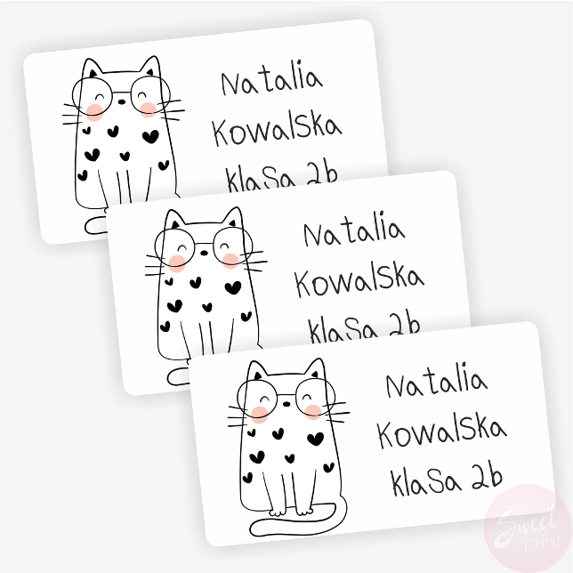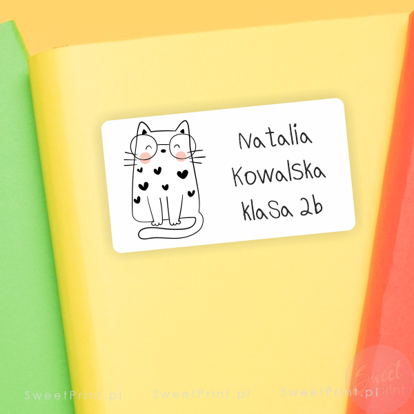 Oznacz książki, zeszyty i przybory szkolne Twojego dziecka za pomocą tych kolorowych naklejek z kotkiem.
