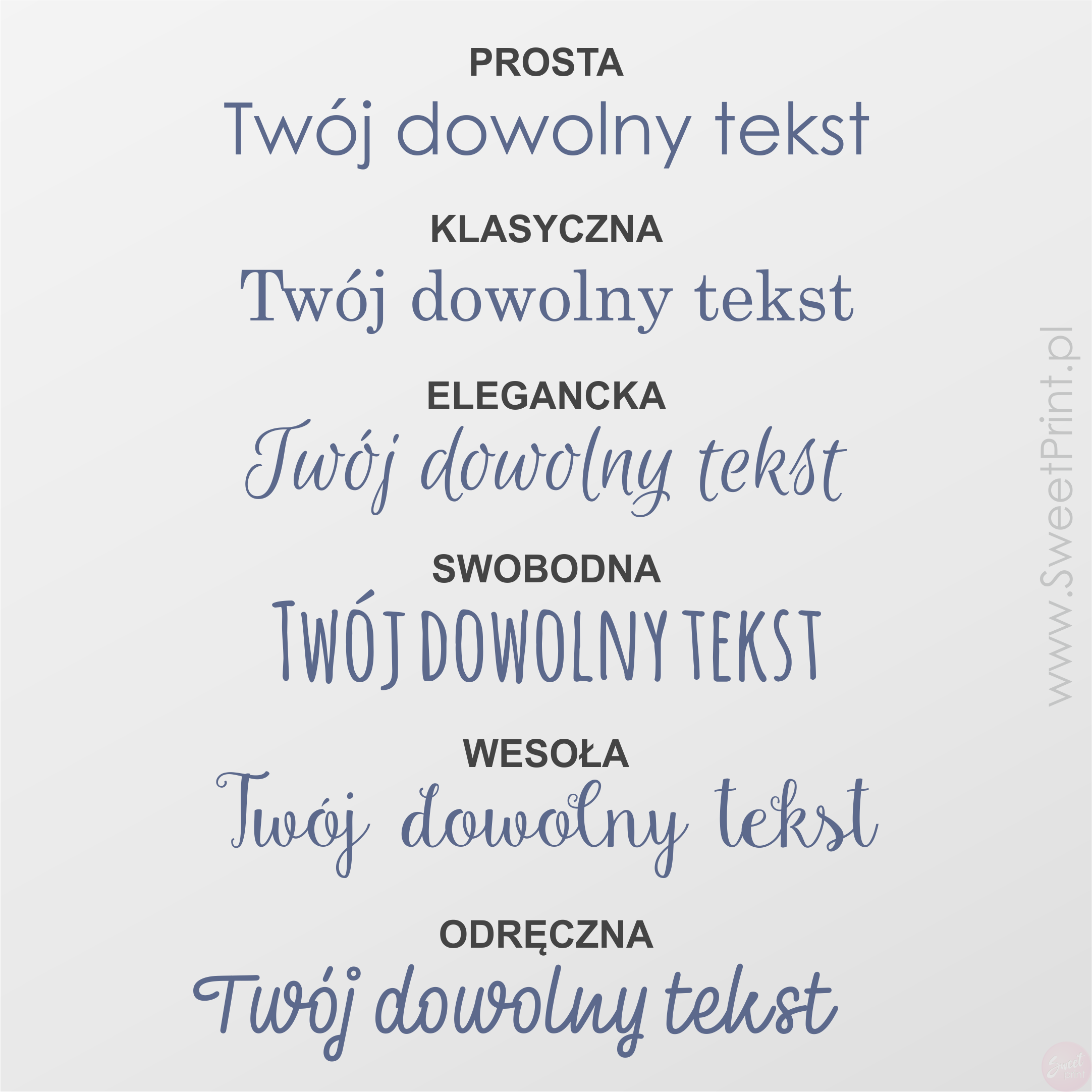 Kolor nadruku: podaj preferowany kolor liter w formularzu zamówienia. Drukujemy standardowe kolory, nie robimy złotych, srebrnych lub innych metalizowanych nadruków