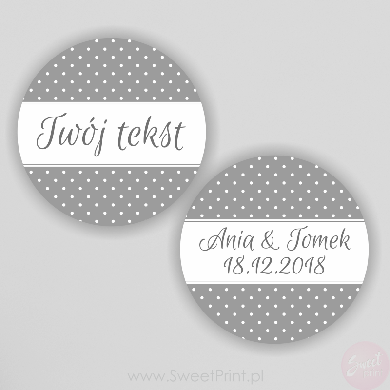 Okrągłe naklejki POLKA DOT z Twoim tekstem - SZARE
