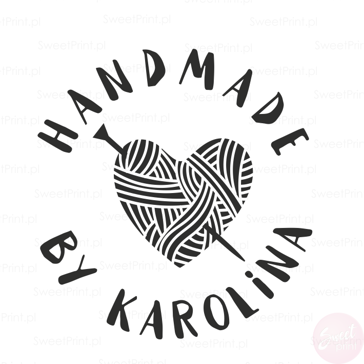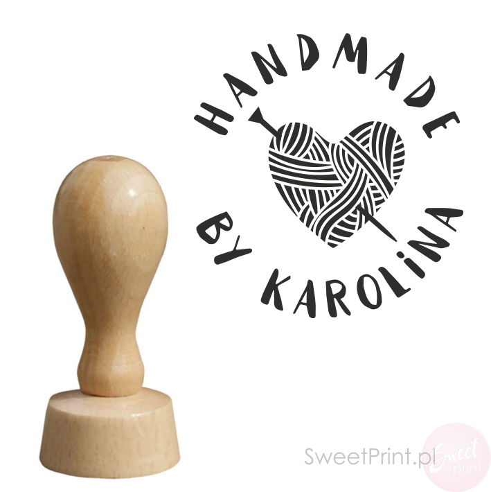 Personalizowana pieczątka z kłębkiem włóczki w kształcie serca oraz Twoim tekstem.