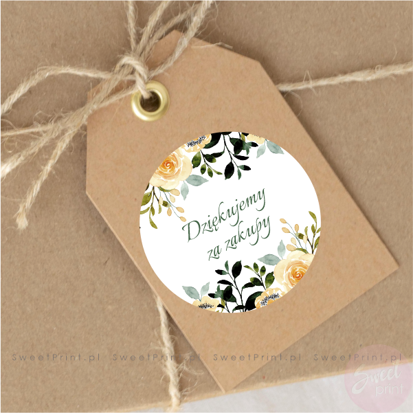 Na tych okrągłych naklejkach z kwiatami wydrukujemy Twój dowolny krótki tekst.