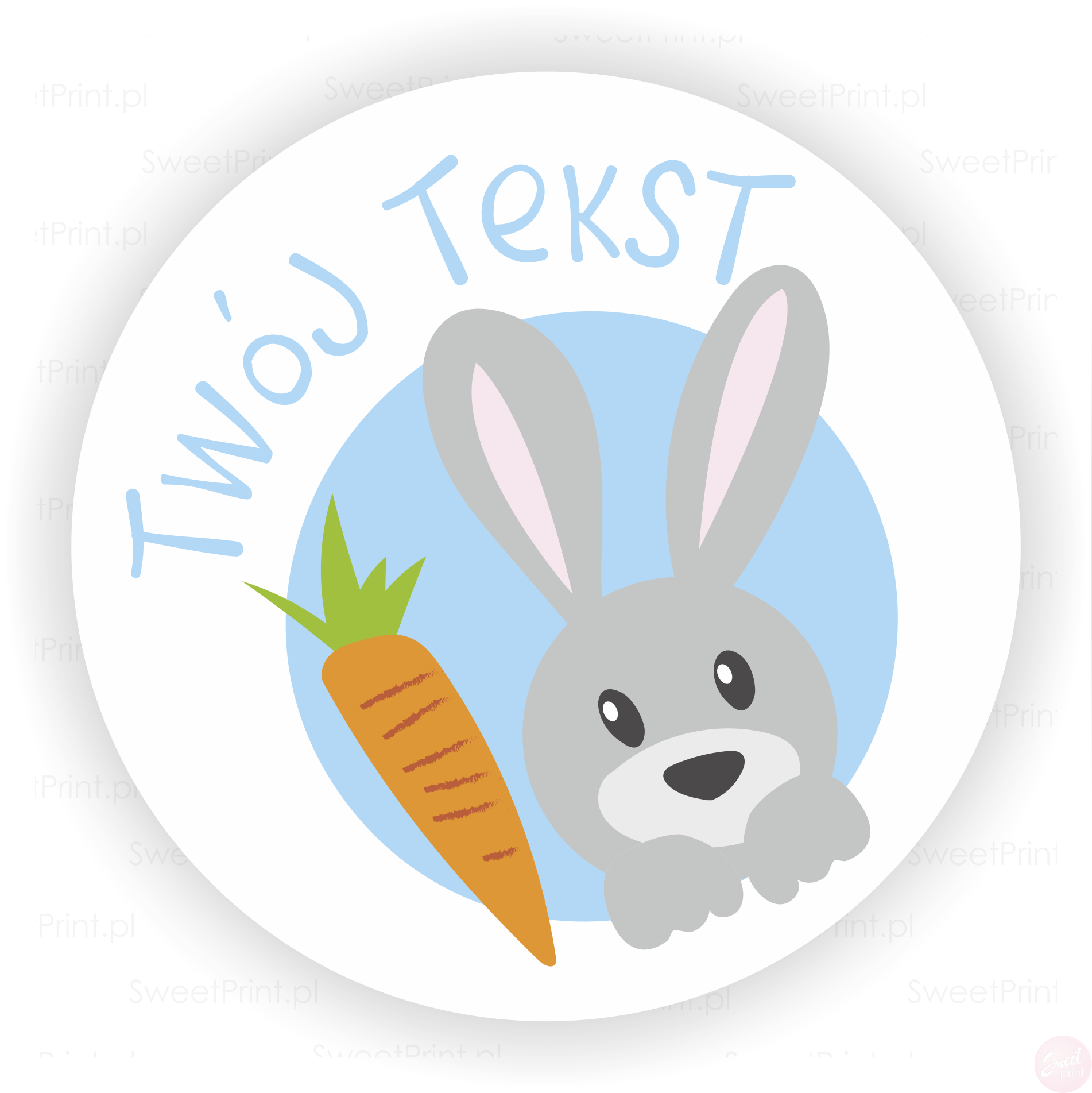 Na tych pastelowych naklejkach z zajączkiem wydrukujemy Twoje imię, slogan czy inny dowolny krótki tekst. Możesz też wybrać opcję bez personalizacji.