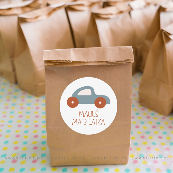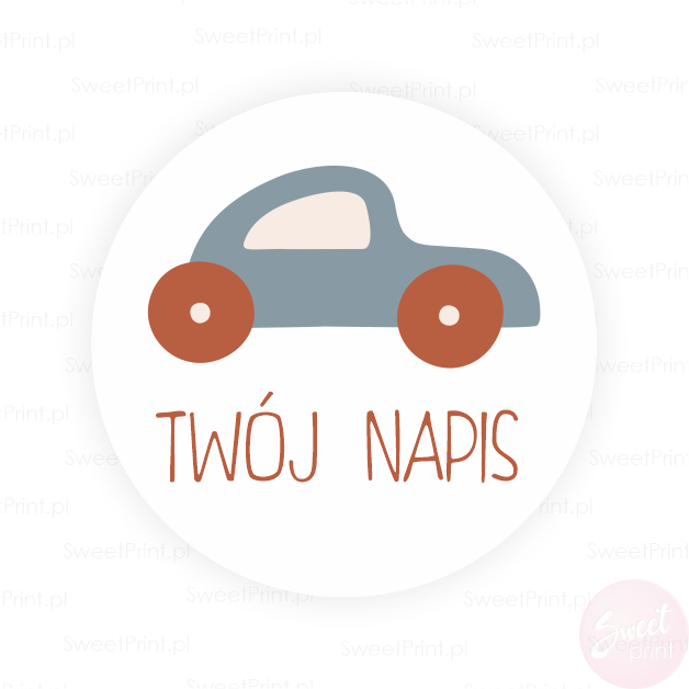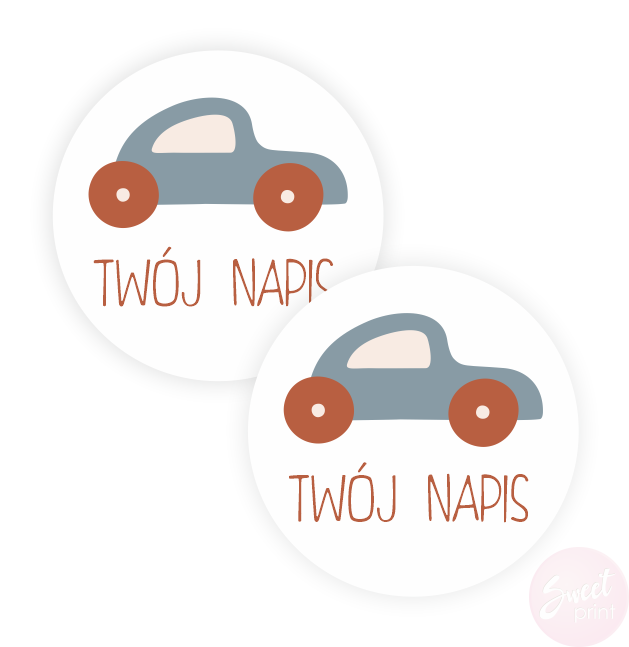 Na tych okrągłych naklejkach z samochodem wydrukujemy Twój dowolny krótki tekst.