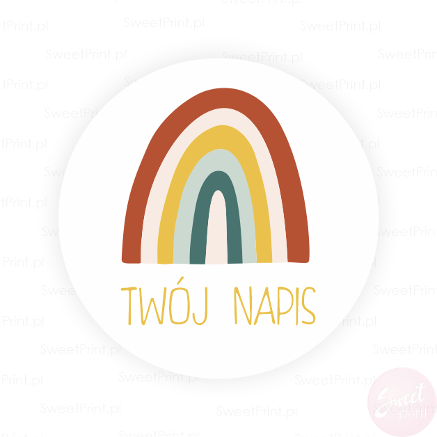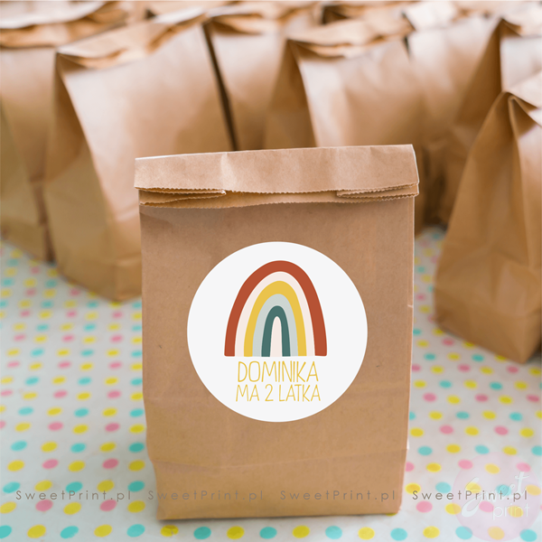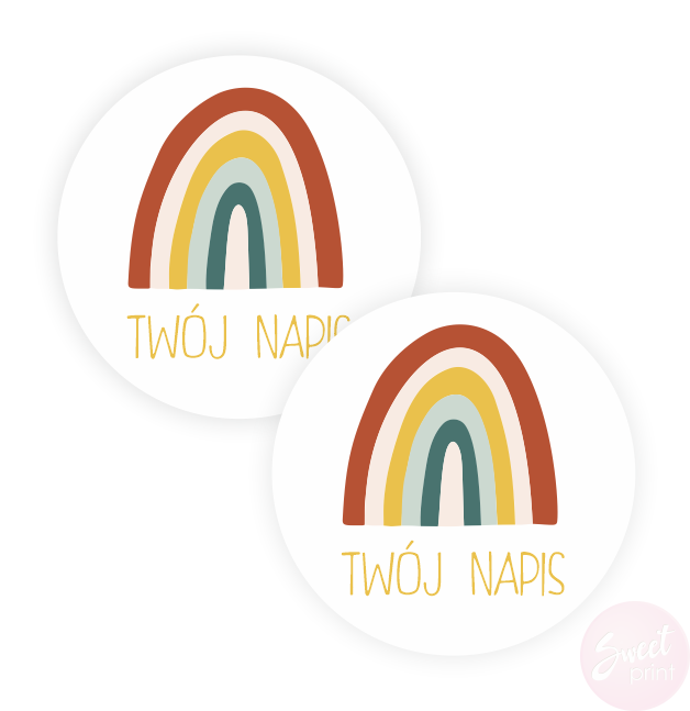 Na tych okrągłych naklejkach z tęczą wydrukujemy Twój dowolny krótki tekst.