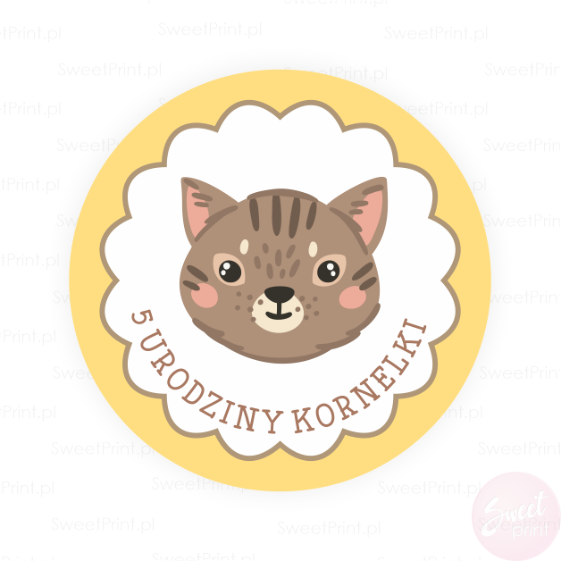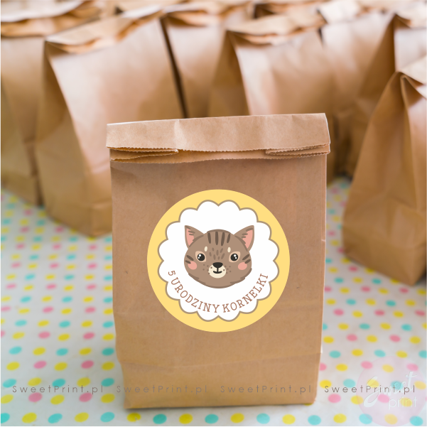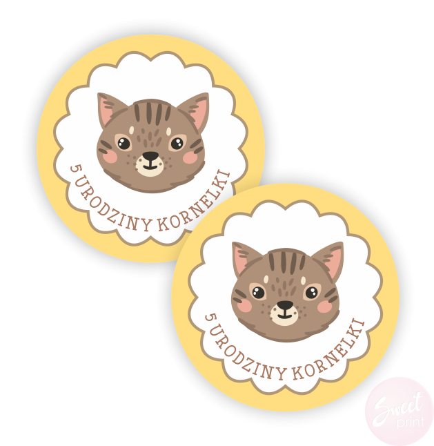 Na tych okrągłych naklejkach z kotkiem wydrukujemy Twój dowolny krótki tekst.
