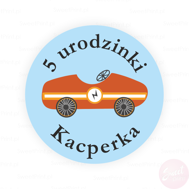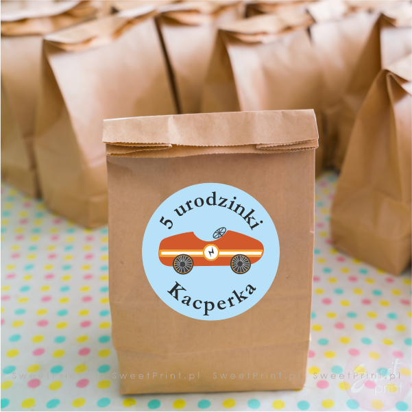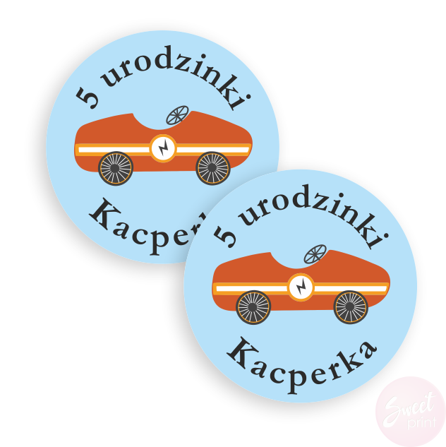 Stwórz niesamowite dekoracje, zaproszenia i podziękowania dzięki naszym personalizowanym naklejkom. Na tych okrągłych naklejkach z samochodem wyścigowym wydrukujemy Twój dowolny krótki tekst.