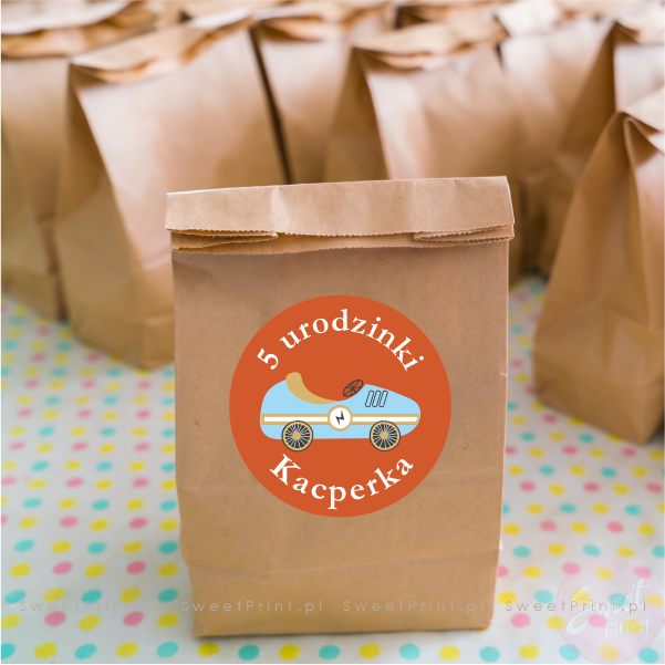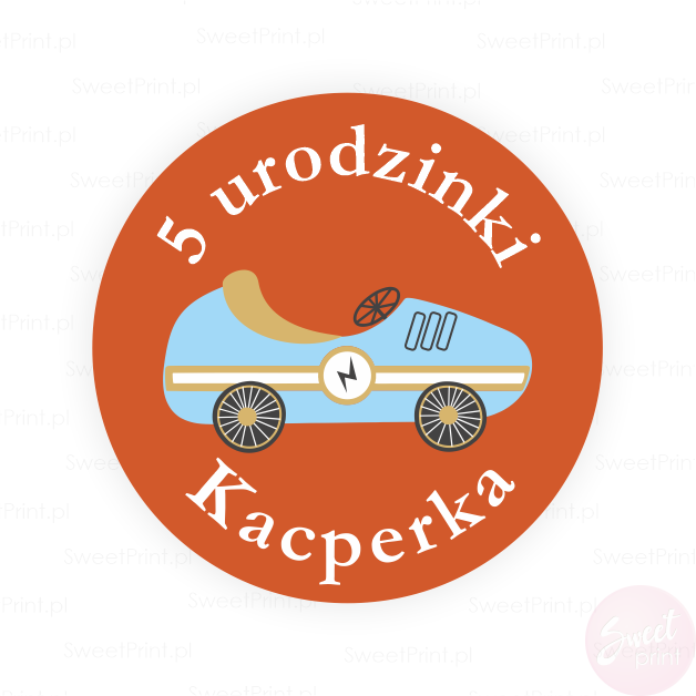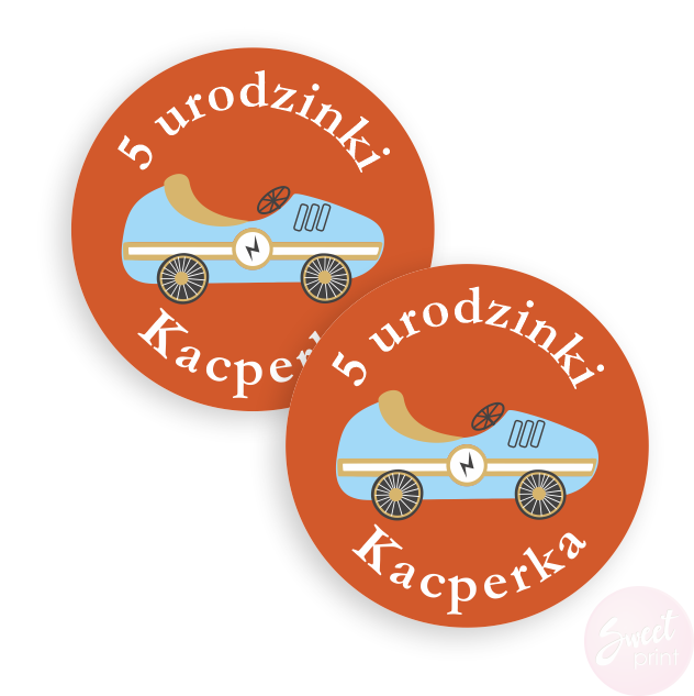 Stwórz niesamowite dekoracje, zaproszenia i podziękowania dzięki naszym personalizowanym naklejkom. Na tych okrągłych naklejkach z samochodem wyścigowym wydrukujemy Twój dowolny krótki tekst.