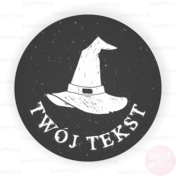 Na tych halloweenowych naklejkach z kapeluszem czarownicy możesz umieścić dowolny, krótki tekst.