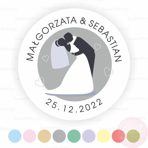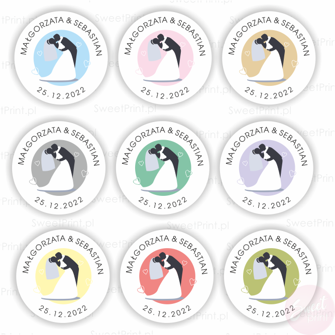 Personalizowane naklejki z motywem pary młodej i kolorowym tłem, które możesz dopasować do koloru przewodniego na Waszym ślubie i weselu. Wydrukujemy na nich imiona, datę ślubu, podziękowanie lub dowolny krótki tekst.