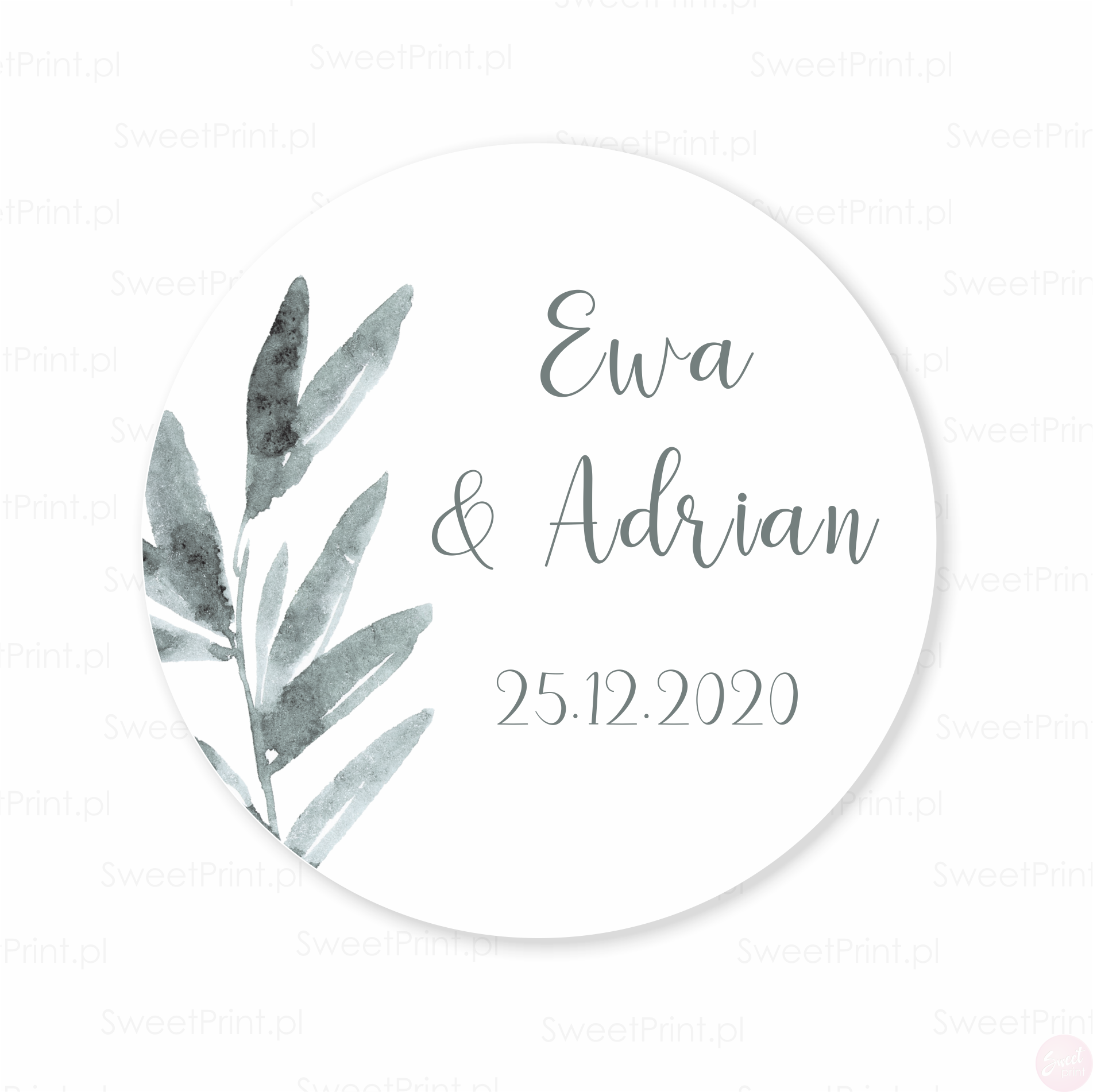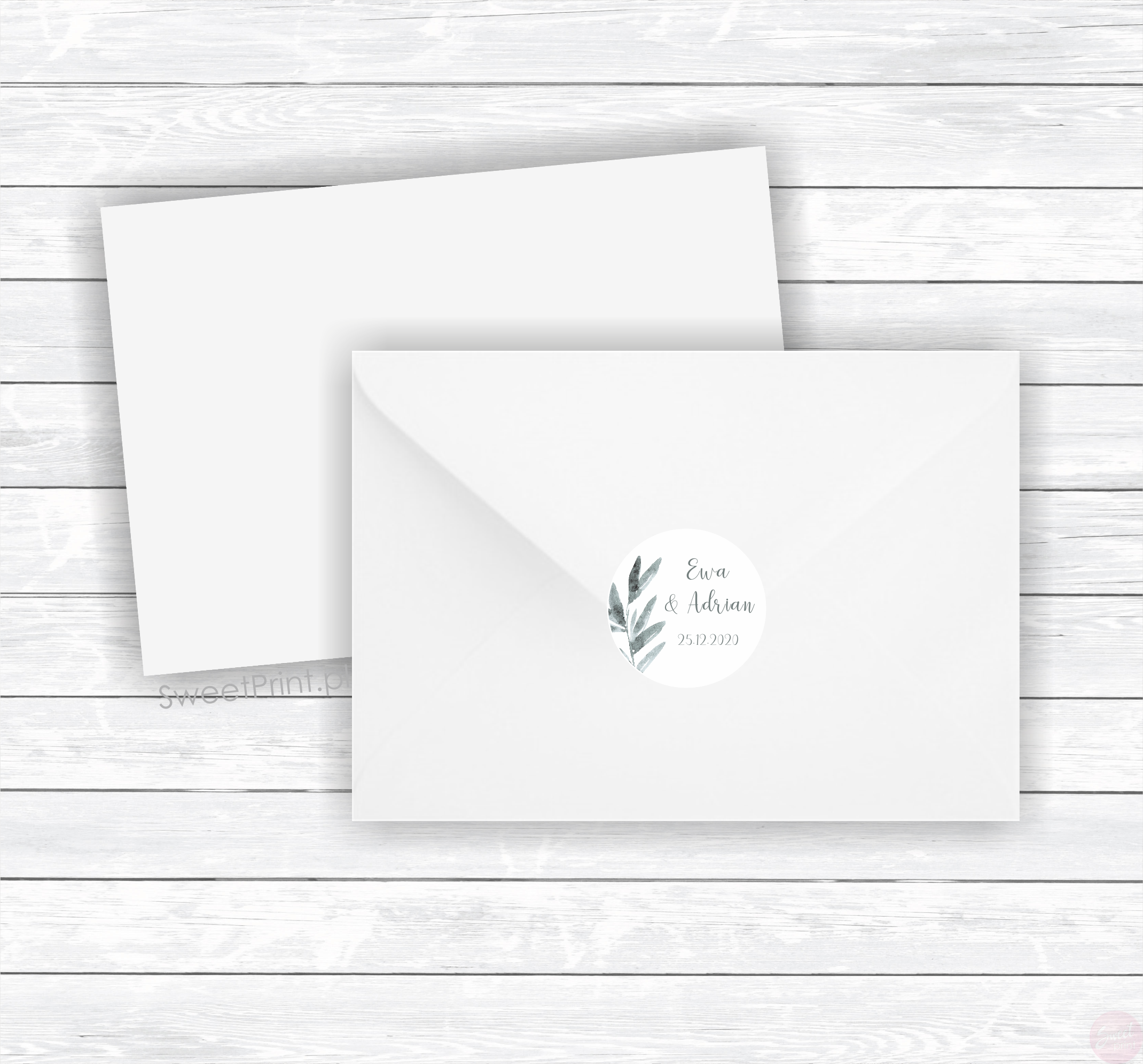 Personalizowane naklejki ślubne z listkami.