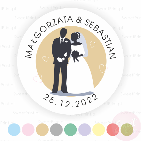 Personalizowane naklejki z motywem pary młodej i kolorowym tłem, które możesz dopasować do koloru przewodniego na Waszym ślubie i weselu. Wydrukujemy na nich imiona, datę ślubu, podziękowanie lub dowolny krótki tekst.