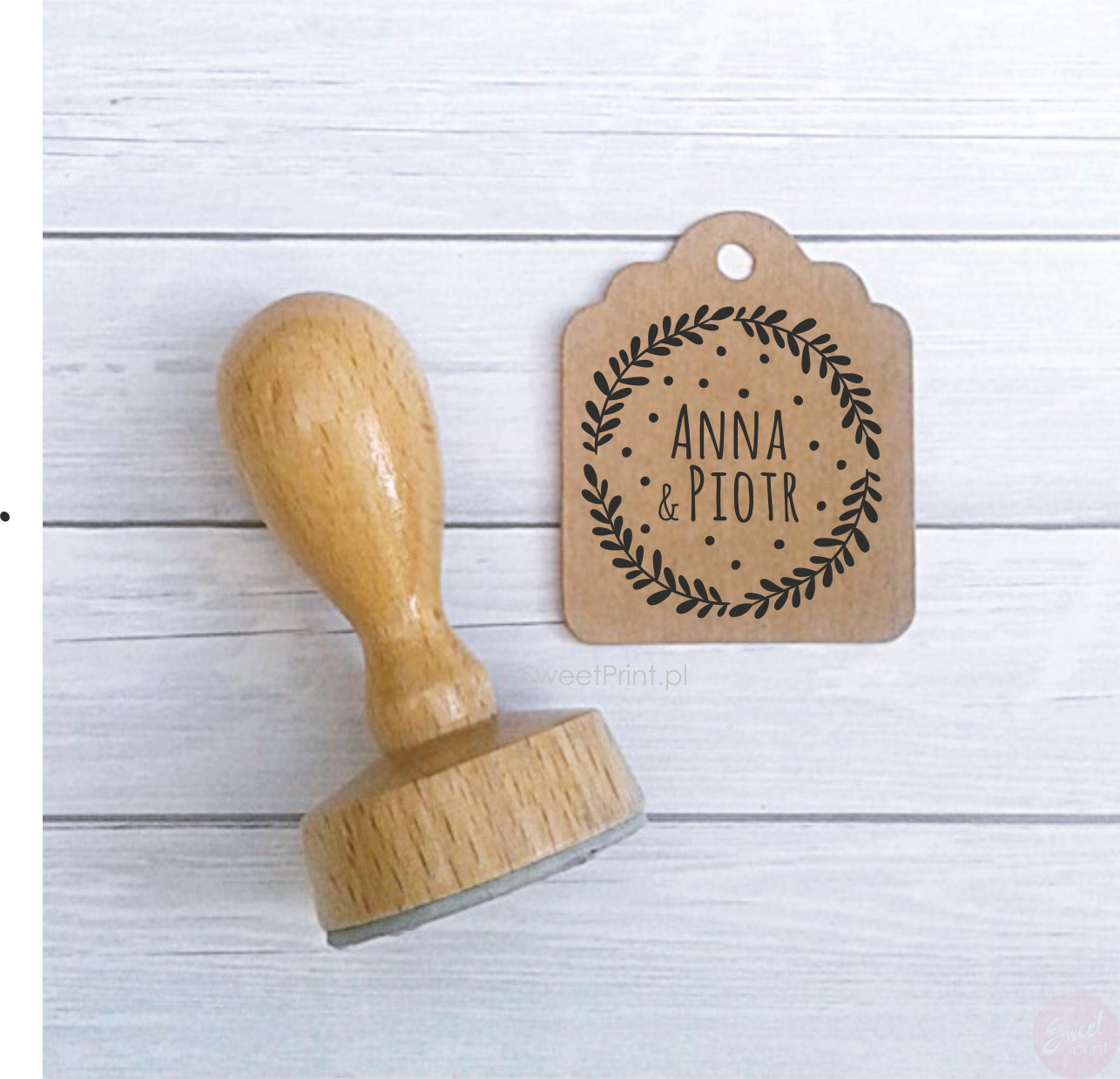 Drewniany stempel z ozdobnym wiankiem.