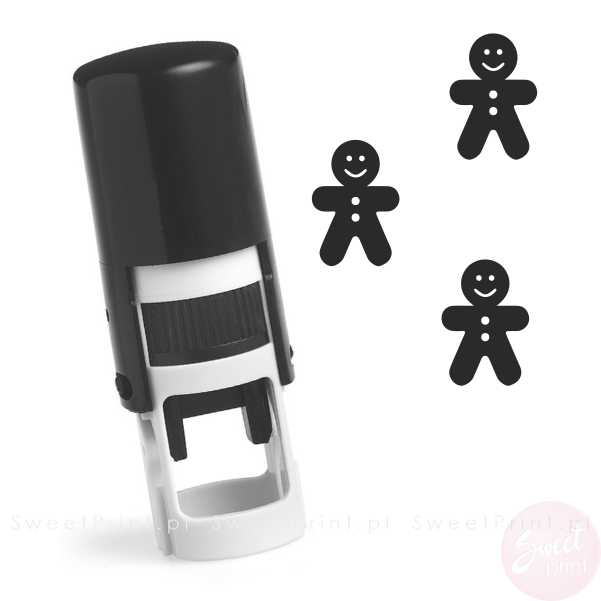 Okrągła pieczątka automatyczna ze znaczkiem w kształcie świątecznego pierniczka.