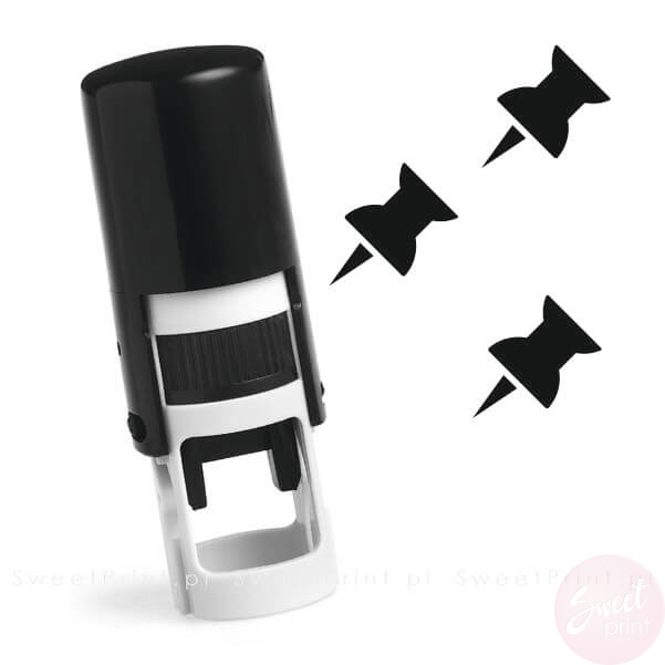 Okrągła pieczątka automatyczna ze znaczkiem w kształcie pinezki.