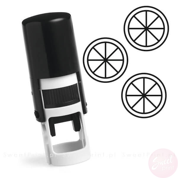 Okrągła pieczątka automatyczna ze znaczkiem w kształcie plastra pomarańczy.