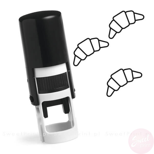Okrągła pieczątka automatyczna ze znaczkiem w kształcie rogalika.