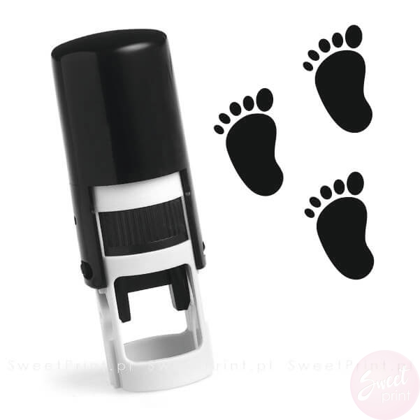 Okrągła pieczątka automatyczna ze znaczkiem w kształcie stópki.