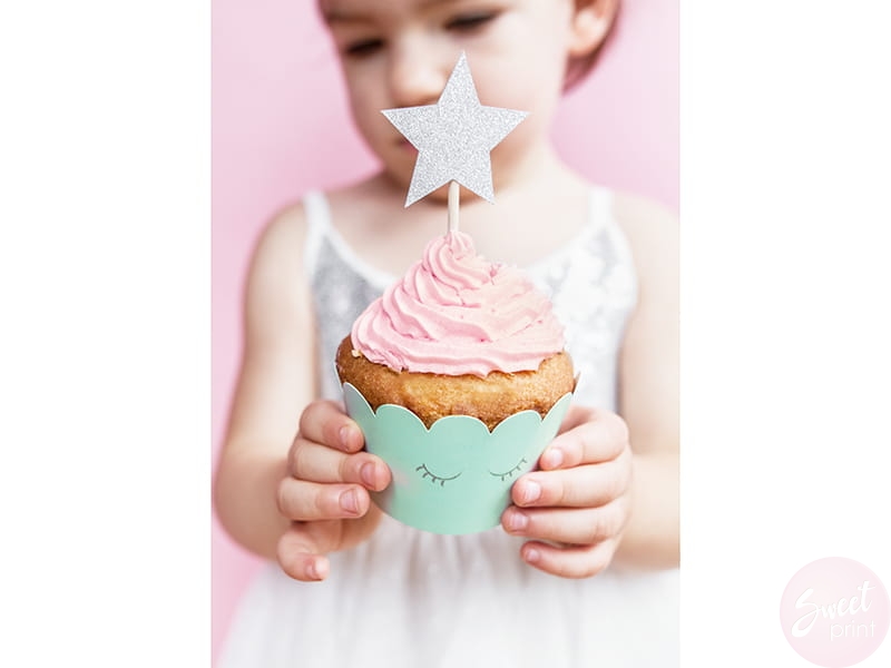 Srebrne toppery w kształcie srebrnych gwiazdek - idealne do dekorowania muffinek i wypieków