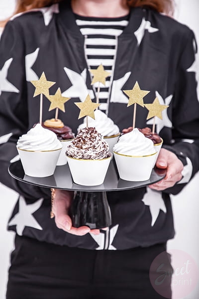 Złote toppery / pikery w kształcie srebrnych gwiazdek - idelane do dekoracji ciast i muffinek.