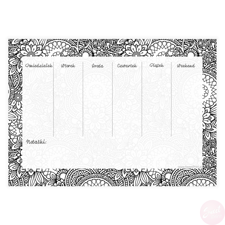 Do pobrania tygodniowy planer - kolorowanka w formacie A4 z polami do zaplanowania całego tygodnia oraz miejscem na notatki.