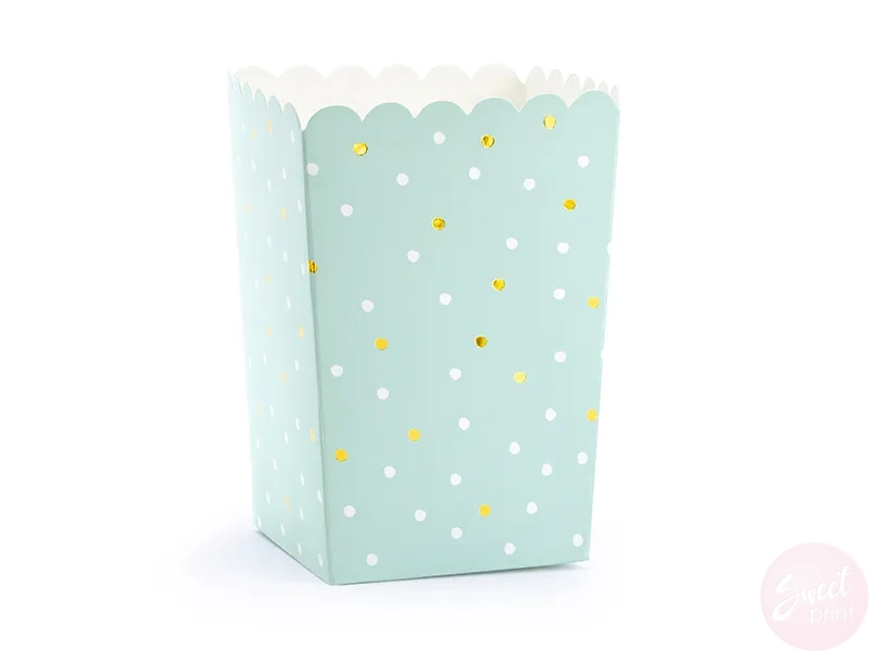 Papierowe pudełka na popcorn, miętowe w złote i białe kropki
