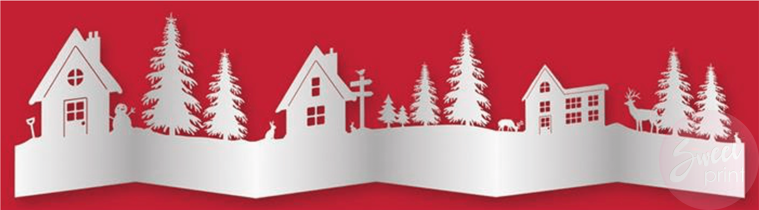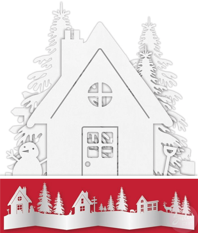 Urocza kartka z wyciętym zimowym miasteczkiem. Po rozłożeniu będzie oryginalną, świąteczną dekoracją. Kartkę można ozdobić lub pokolorować według uznania.