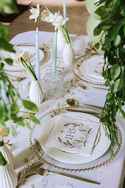 Papierowe serwetki z kwiatowym motywem i złotym, metalizowanym napisem "Pierwsza Komunia Święta" będą ozdobą każdego komunijnego stołu czy bufetu.