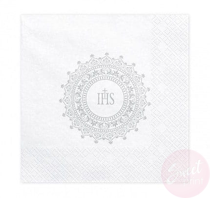 Papierowe serwetki ze srebrnym nadrukiem IHS będą ozdobą każdego komunijnego stołu czy bufetu.