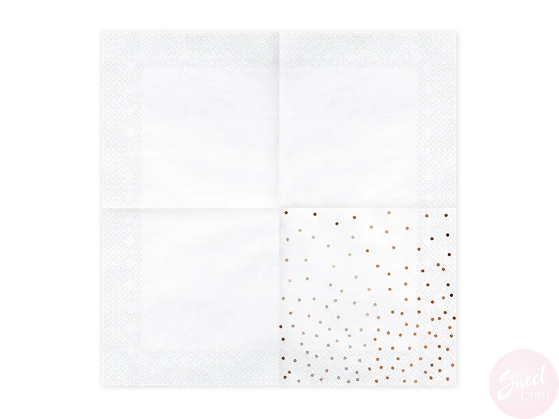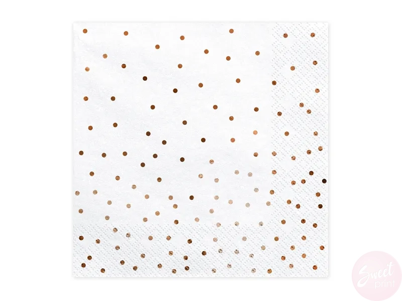 Białe, papierowe serwetki w kropki w kolorze różowego złota będą ozdobą każdego imprezowego stołu czy bufetu.